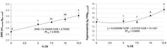 Mean values and standard deviation of swelling index (SWE) and hygroscopicity of extrudate according to carob bean (CB) %. Figure includes the equation fitted significantly (p < 0.05) and R2 adjusted. Letters indicate homogeneous groups established by the ANOVA (p < 0.05) for each parameter analyzed.