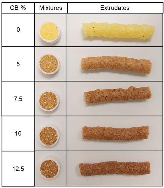 Appearance of studied unprocessed mixtures and extrudates of corn flour with different concentrations (0, 5, 7.5, 10, 12.5, and 15%) of carob bean (CB).