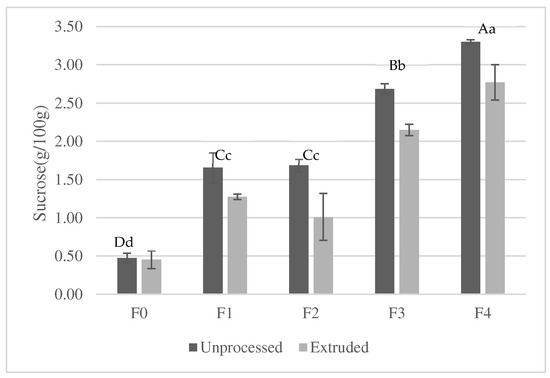 Free sugars of unprocessed and extruded samples were analyzed, with sucrose being the main free sugar quantified, as can be seen in Figure 5. The sucrose content of unprocessed corn flour is 0.47 g/100 g (F0), while carob bean flour has a sucrose content of 58.73 g/100 g. The addition of carob bean flour to the formulations results in an increase in the sucrose content up to 3.30 g/100 g in the F4 sample, corresponding to 87.5% corn flour and 12.5% carob bean. Extruded samples formulated with carob bean flour showed less sucrose content than unprocessed samples due to the Maillard reaction that took place in the extrusion process at high temperatures, with a consequent reduction in the content of simple sugar [38]. The loss of sucrose content due to the extrusion process ranged between 16 and 40% in samples formulated with carob bean (F1 to F4).