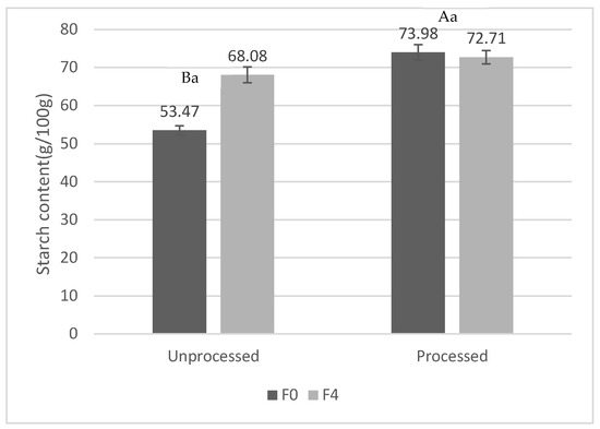 Starch content of formulation F0 (100% corn flour) and F4 (87.5% corn flour +12.5% carob bean), unprocessed and extruded (g/100 g, dry weight) (mean ± SD). The same letter in capitals indicates homogeneous groups as established by ANOVA (p < 0.05), between unprocessed and processed samples, while small letters refer to the effect of formulation (F0 and F4).