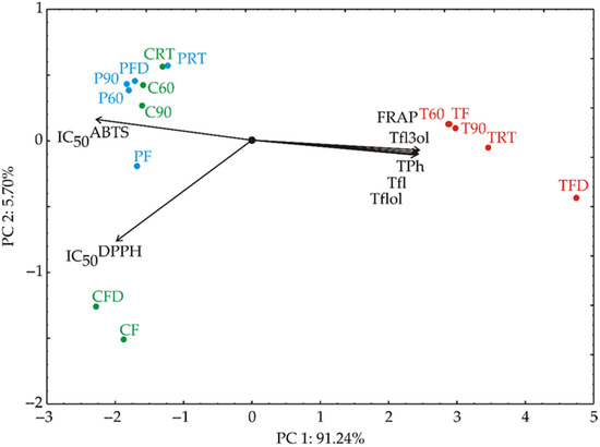 The first cluster (T60, T90, TF, TRT, and TFD) is positively associated with variables such as FRAP, TPh, Tfl, Tflol, and Tfl3ol, suggesting that these samples have high values for total phenolics, total flavonoids, and related antioxidant activities. The second cluster (C60, C90, P60, P90, PFD, CRT, PRT, and PF) is positioned along the negative axis of PC1, indicating a strong association with the IC50 values for ABTS and DPPH, suggesting these samples have relatively higher free radical scavenging activities. The third cluster (CFD and CF) is located near the lower-left quadrant and is strongly influenced by the IC50DPPH vector, indicating these samples have a distinctive antioxidant profile dominated by the DPPH scavenging activity.