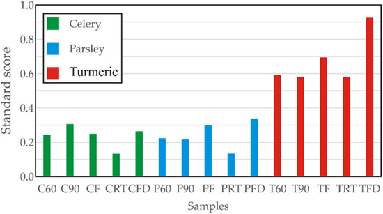 The ranking for 15 samples involved comparing raw data with extreme values, following the methodology outlined by Brlek et al. [30]. Criteria for ranking were based on parameters such as total phenolic, total flavonoids, total flavonols, total flavan-3-ols contents, FRAP antioxidant test, as well as lightness L* (for all samples), a* and b* values (for turmeric samples) with a preference for higher values, and IC50DPPH, IC50ABTS (for all samples), a* and b* values (for celery and parsley samples) with a preference for lower values.