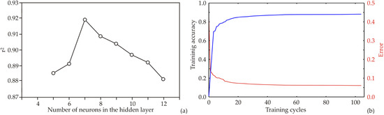 For the ANN modeling phase, which included 15 samples, the data were divided into training (60%), cross-validation (20%), and testing (20%) sets. To enhance accuracy, min–max normalization was applied to standardize both input and output data. The proposed multilayer perceptron ANN model (MLP) featured a three-layer architecture with feedforward design and utilized backpropagation training, as discussed in previous studies [27,28]. The hidden layer consisted of 5 to 10 neurons, and various activation functions (tangent, sigmoidal, exponential, and identity) were tested. The BFGS algorithm was employed to construct the ANN model, iteratively adjusting weights and biases across 100,000 different configurations. The objective was to minimize square error until both the learning and cross-validation curves approached zero.