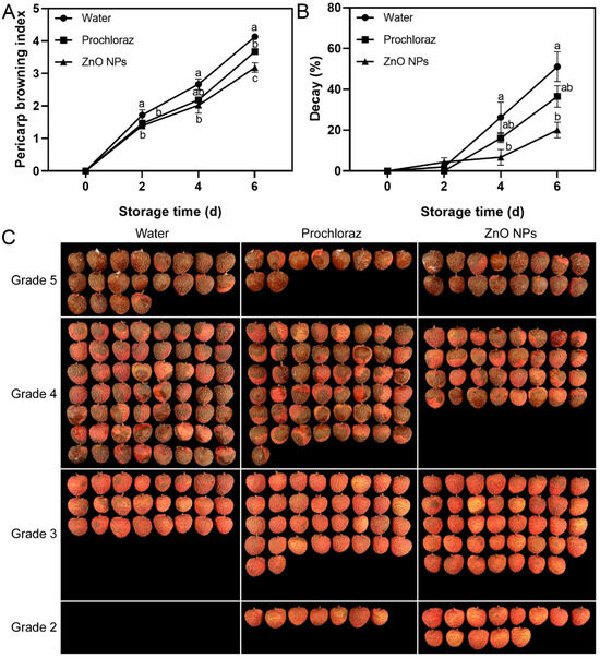 3.1. Effect of ZnO NPs Treatment on Pericarp Browning and Decay of Litchi Fruit