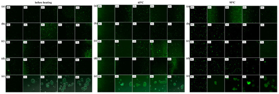 Confocal laser scanning microscopy images of pandan pigment solutions enriched with different concentrations of (a) sucrose, (b) lactose, (c) rice starch, (d) whey protein, and (e) soy protein isolate before and after heating at 65 °C for 15 min, 95 °C for 15 min, 15 °C for 15 min, and 121 °C for 15 min.