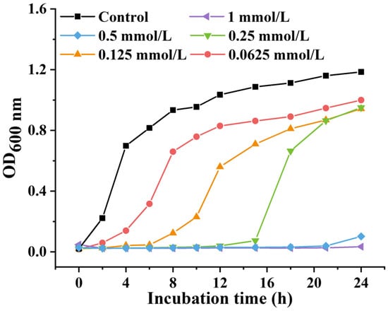 To assess the inhibitory potential of PEITC against S. aureus, an MIC assay was conducted in a 96-well plate using the microdilution broth method. The MIC of PEITC against S. aureus was determined to be 1 mmol/L. The effects of different concentrations of PEITC on S. aureus were evaluated by bacterial growth curves using the shake flask method. As shown in Figure 2, bacterial growth was inhibited to various degrees by treatment with PIETC within 24 h. The time for complete inhibition of bacterial growth decreased with decreasing PEITC concentration from 0.125 to 0.5 mmol/L, and S. aureus began to grow at 6, 12, and 24 h, respectively. When the concentration of PEITC reached 1 mmol/L, the proliferation of S. aureus was entirely inhibited within 24 h. As the concentration of PEITC increased from 0.0625 to 0.5 mmol/L, the inhibition time of S. aureus growth ranged from 2 h to 21 h.
