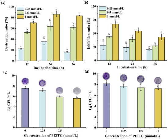Effects of PEITC on S. aureus biofilms. Destructive effect on mature biofilms of S. aureus (a); Inhibitory effect on biofilm formation of S. aureus (b); Number of viable bacteria beneath the biofilms after treatment with PEITC for 24 h in the destruction process of biofilm (c); Number of viable bacteria beneath the biofilms after treatment with PEITC for 24 h in the inhibition process of biofilm (d); Different lowercase letters indicate a statistically significant difference between various concentrations (p ≤ 0.05).