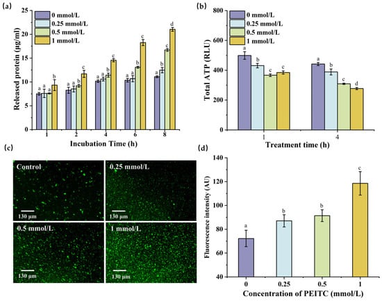 Figure 4b shows the total ATP content in S. aureus treated with PEITC. The total ATP content decreased significantly from 1 to 4 h at all concentrations of PEITC, and that of the control group decreased from 499.07 ± 25.50 RLU to 441.33 ± 10.21 RLU. After treatment with different concentrations of PEITC, the total ATP content was markedly different from that observed in the control group (p ≤ 0.05). When S. aureus was incubated with1 mmol/L PEITC for 4 h, the total ATP content in S. aureus reached the lowest value of 277.19 ± 7.12 RLU, while the effect of PEITC decreased the total ATP in E. coli to approximately 400.31 ± 2.48 RLU []. This may indicate that total ATP production in S. aureus exhibits greater sensitivity to PEITC.