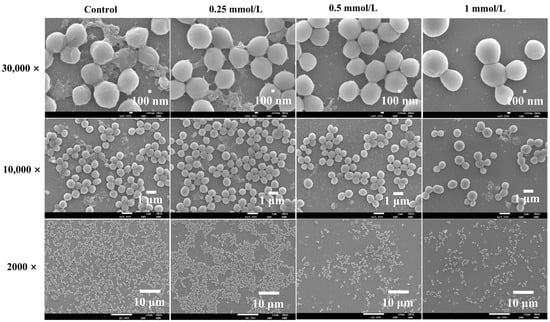 To create the mature biofilm model, coverslips were used as carriers. Coverslips were placed into a 6-well plate with bacteria and varying concentrations of PEITC and incubated for 24 h. The coverslips were then treated according to Fan et al. []; in brief, the coverslips were subsequently washed with 0.1 M phosphate buffer and fixed in 2.5% (w/v) glutaraldehyde (Sigma-Aldrich, Saint Louis, MO, USA) at 4 °C for 12 h. After two rinses with distilled water, the cells were dehydrated in a series of graded ethanol solutions (50%, 70%, 90%, and 100%) for 15 min each. The samples were then air-dried at room temperature and coated with a thin layer of gold–palladium, and the biofilms were visualized by SEM (JSM-7800-F, LEOL, Hokkaido, Japan).