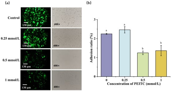 The effect of PEITC on the adhesion of S. aureus. Observation of S. aureus adhesion to NCM460 cells under fluorescence microscopy (a); Effect of PEITC on the adhesion ratio of S. aureus to NCM460 cells (b). Different lowercase letters indicate a statistically significant difference between various concentrations (p ≤ 0.05).