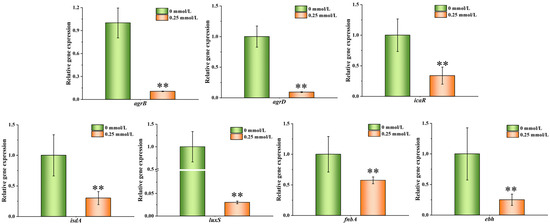 To determine whether PEITC can affect the expression of S. aureus genes, nine representative genes related to adhesion and biofilm formation were screened for qRT–PCR validation in 0.25 mmol/L PEITC (Figure 7). Compared with those in the control group, extremely significant decreases in agrB, agrD, ebh, luxS, icaR, isdA, and fnbA were detected (p ≤ 0.01). Among these, the most pronounced alteration was observed in luxS. Following exposure to 0.25 mmol/L PEITC, the relative expression level of luxS decreased to 3.04% of that in the control group.