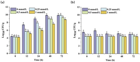 Application of PEITC to inhibit the growth of S. aureus in beef preserved at 25 °C (a) and 4 °C (b). Different lowercase letters on each time range indicate a statistically significant difference between various concentrations (p ≤ 0.05).