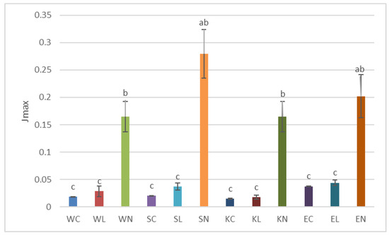 Rheological properties of cookie dough (maximum creep compliance, Jmax); W—modern wheat; S—spelt; K—Khorasan; E—emmer; C—control; L—lyophilised sourdough addition; N—fresh sourdough addition. Mean values in histogram with the same lower case letter are significantly different according to the ANOVA followed by the Tukey’s test (p < 0.05).