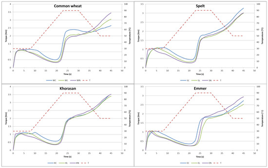 Mixolab curves of tested cookie dough samples; W—modern wheat; S—spelt; K—Khorasan; E—emmer; C—control; L—lyophilised sourdough addition; N—fresh sourdough addition.