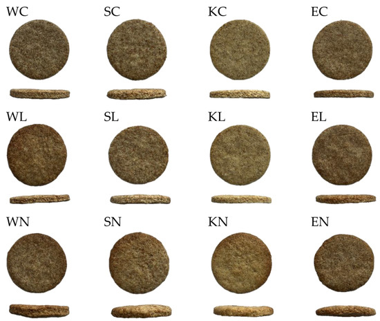 Images of produced cookies; W—modern wheat; S—spelt; K—Khorasan; E—emmer; C—control; L—lyophilised sourdough addition; N—fresh sourdough addition.