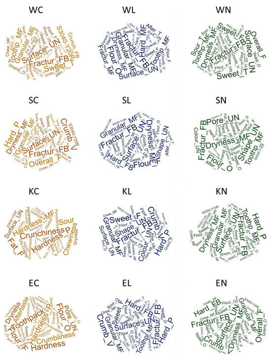Word clouds showing the profile of the samples within each wheat variety group based on attribute frequency. W—modern wheat; S—spelt; K—Khorasan; E—emmer; C—control; L—lyophilised sourdough addition; N—fresh sourdough addition.