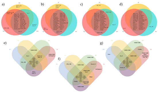 Venn diagram related to the attributes selected by 30% of the panel to describe the cookies: (a) wheat-based; (b) spelt-based; (c) Khorasan-based; (d) emmer-based; (e) all control samples; (f) samples with lyophilised sourdough; (g) samples with native sourdough; W—modern wheat; S—spelt, K—Khorasan; E—emmer; C—control; L—lyophilised sourdough addition; N—fresh sourdough addition.