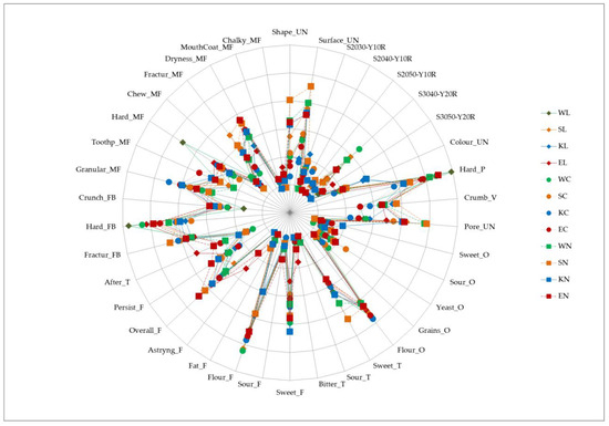 Spider plot with intensity and frequencies; W—modern wheat; S—spelt; K—Khorasan; E—emmer; C—control; L—lyophilized sourdough addition; N—fresh sourdough addition.