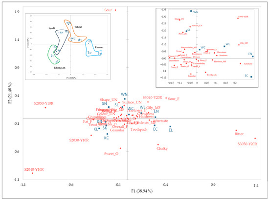 Biplot of cookie samples with attribute differentiation using RATA method; W—modern wheat; S—spelt; K—Khorasan; E—emmer; C—control; L—lyophilised sourdough addition; N—fresh sourdough addition.