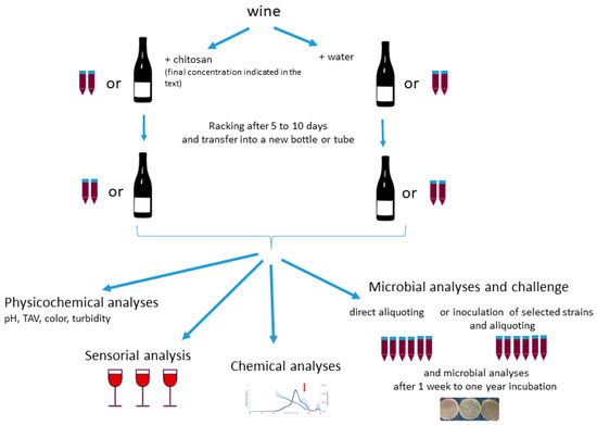 In order to answer these questions, wines were treated with distinct doses of chitosan and sensorial, chemical, and microbiological analyses were performed. An overview of the experimental design is presented in Figure 1.
