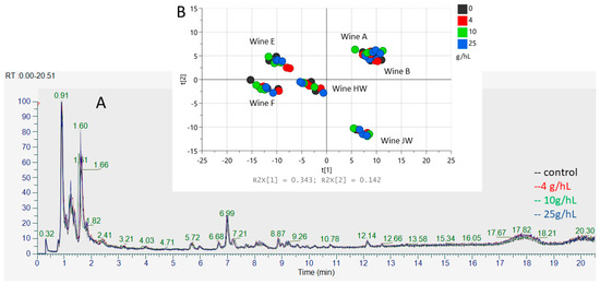 The treatment induced a dose-dependent decrease in sample filterability of red wines B and JW, but not for the other wines examined. The chromatograms and the dataset extracted from the HRMS device showed no visible dose-dependent and reproducible difference. Examples of chromatograms obtained are presented in Figure 2A.