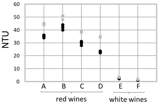 Turbidity analysis of untreated (black) and treated (gray) wines. For all the wines examined, the differences between treated and untreated were significant- (p value < 0.05, 3 assays), but it was not perceived with the naked eye, except for wine E.
