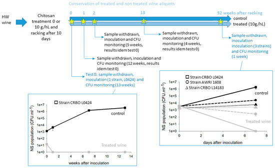 Two separate experiments were conducted in three different wines. The first one was conducted with HW wine. Before starting, the HW wine was pasteurized. It did not contain cultivable microorganisms anymore and it was treated with two doses of chitosan (4 and 10 g·hL−1) or with water (mode 0), racked, and stored for 52 weeks. At 0, 1, 2, 13, and 52 weeks of storage after racking, the cultivable NS populations of the treated and untreated wines were analyzed: as expected, none displayed any detectable population. The wines collected after 0, 1, 2, 13, and 52 weeks of storage were then inoculated with different strains of B. bruxellensis: a chitosan-sensitive strain (CRBO L0424) for the first trial, and this sensitive strain plus two tolerant strains (AWRI 1608 and CRBO L14183) for tests performed after 52 weeks of storage. Figure 4 summarizes the experimental protocol and presents the growth kinetics observed after inoculation at 0 and 52 weeks of storage.