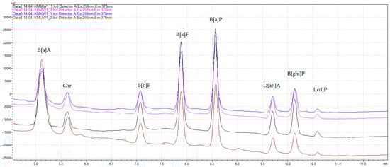 The HPLC–FLD chromatograms of heavy SCF PAHs from chicken breast tenderloin samples marinated in universal marinade (brown), honey mustard marinade (black), chicken marinade (blue), and without marination (pink), grilled on the charcoal grill without a tray.
