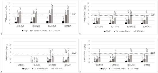 The concentration levels of B[a]P and the four heavy/marker PAHs in the analyzed samples did not exceed the requirements of Commission Regulation (EU) No. 915/2023 of 25 April 2023 for grilled meat products (5 µg/kg for B[a]P, 30 µg/kg for the four heavy PAHs) [20]. Therefore, it can be concluded that each final product did not pose a health problem.