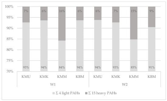 Describing the samples prepared on the charcoal grill with and without an aluminum tray (Figure 4, Table S1), the four light PAHs constituted 84–94% of all PAHs under investigation, and the 15 heavy PAHs averaged 6–16% of the total contents of the 19 PAHs. The results from this study revealed that the concentrations of PAHs in grilled chicken breast tenderloin samples depend on the marinade used, and that marinades with a high sugar content cause a higher level of contamination with heavy PAHs. Therefore, the highest percentages of the 15 heavy PAHs in the total 19 PAHs’ contents were observed for samples marinated in the honey mustard marinade and averaged 15 and 16% for the charcoal grill with and without an aluminum tray, respectively.