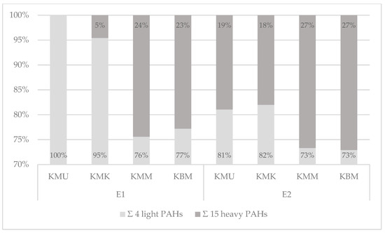According to the Pearson correlation analysis, as the weight loss increased, the contamination with the 15 heavy PAHs showed a significant, strong positive correlation (p < 0.001). However, comparing the results obtained for the correlation of weight loss and the sum of the 19 PAHs, no correlation was observed (p = 0.117), which may have been due to greater variation in the contents of light PAHs in the samples.