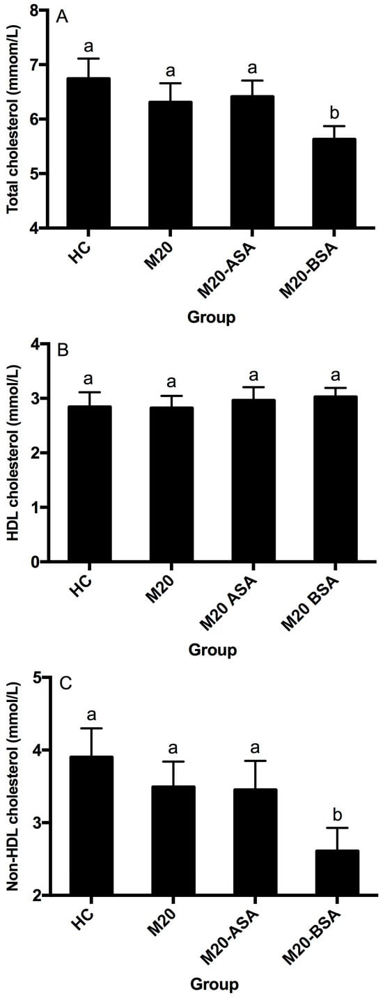 Neither the non-adapted nor acid stress-adapted cells significantly affected serum HDL-, non-HDL, and total cholesterol concentrations in hamsters (p > 0.05), although they showed slightly lower serum total and non-HDL cholesterol concentrations compared to the hypercholesterolemic control (HC) group (Figure 4A–C). Bile stress-adapted cells significantly reduced serum non-HDL and total cholesterol concentrations (p < 0.05) but had no significant effect on serum HDL cholesterol concentration (p > 0.05). The M20-BSA group showed 33.1% and 16.5% lower serum non-HDL and total cholesterol concentrations, respectively, compared to the HC group, as well as 25.2% and 10.8% lower concentrations compared to the M20 group.
