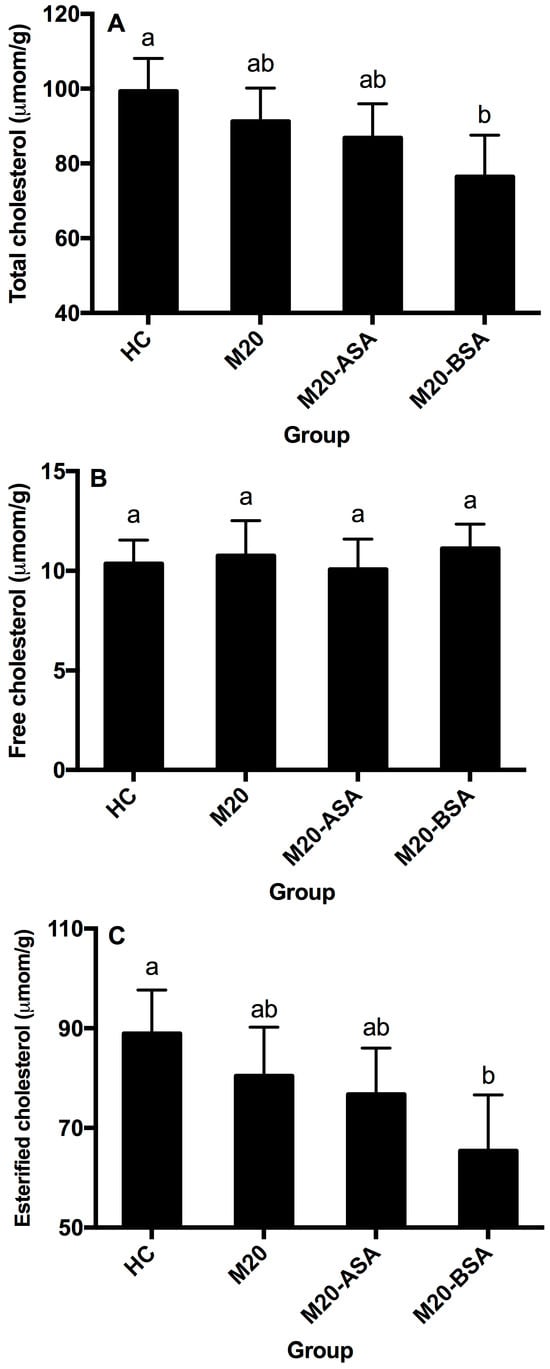 Following this, the hamsters were euthanized, and their livers were removed, rinsed with physiological saline, dried with filter paper and frozen at 86 °C until analysis. For hepatic lipid analysis, the frozen liver samples (1 g) were homogenized in 5 mL of cold PBS, and the homogenates (1 mL) were taken and extracted three times with 10 mL of chloroform–methanol (2:1, v/v). The extracts were analyzed for free, and total cholesterol was determined by gas chromatography [28]. Esterified cholesterol was calculated by subtracting free cholesterol from total cholesterol.