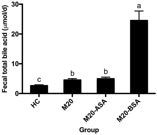 Both non-adapted and acid stress-adapted cells promoted fecal bile acid excretion in hamsters, with the M20 and M20-ASA groups showing 1.72- and 1.87-fold higher daily excretion levels compared to the HC group, respectively (Figure 6). Bile stress-adapted cells exhibited a greater ability to promote fecal bile acid excretion than both non-adapted and acid stress-adapted cells. The M20-BSA group showed 9.2-, 5.4-, and 5.0-fold higher daily fecal bile acid excretion levels compared to the HC, M20, and M20-ASA groups, respectively.