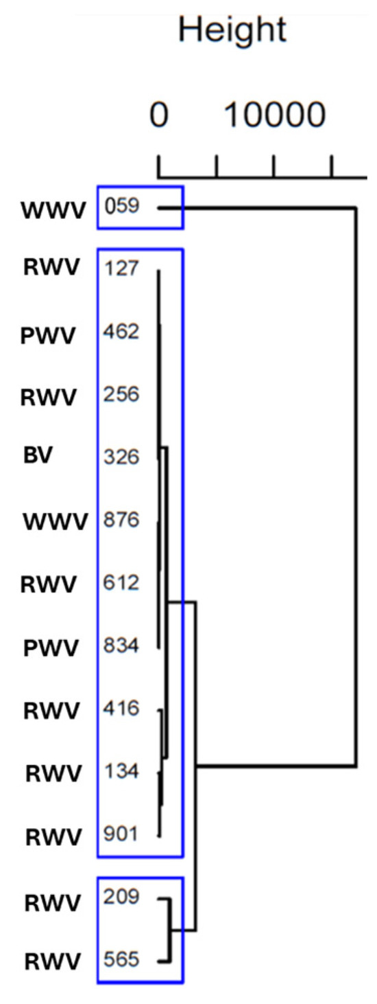 | PWV | 834 | n.d. | n.d. | n.d. | n.d. | n.d. | n.d. | n.d. | n.d. | 2.64 ±0.02 d | 4.49 ±0.05 c | 2.82 ±0.03 c | n.d. | n.d. | n.d. | n.d. | 0.91 ±0.01 a | 0.65 ±0.01 b |