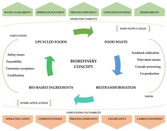 Food waste generation continues to rise worldwide, and given the modern world’s challenges to its prevention, its mass-scale valorization appears as a major step towards a more sustainable agri-food value chain, food security, circular bioeconomy, and climate change mitigation. This can be achieved through cutting-edge biotechnological biorefinery processes that allow the transformation of these renewable feedstocks into food-grade ingredients and specialty chemicals, such as organic acids, phenolic compounds, bioactive peptides, sweeteners, and prebiotics, among other valuable metabolites. These bio-based products emerge as natural alternatives to some synthetic or artificially obtained molecules currently used as additives and can be used to formulate clean-label foods, food supplements, nutraceuticals, and other consumer goods. However, increased investment, biotechnological advancement, and public awareness emerge as key drivers of progress that various stakeholders must work on to achieve multi-product cascade biorefining schemes, FLW decomposition to sub-zero level, and safe, high-quality upcycled products.