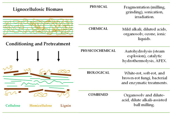 Representative structure of lignocellulosic biomass and conditioning and pretreatment methods used to improve its fractionation into cellulose, hemicellulose, and lignin. Physical methods (e.g., milling, grinding, sonication, irradiation) increase surface area and mass transfer, while chemical (e.g., mild alkali, diluted acid, organosolv, ozone, ionic liquids), physicochemical (e.g., autohydrolysis/steam explosion, catalytic hydrothermolysis, ammonia fiber expansion (AFEX)), biological (e.g., white-rot, soft-rot, and brown-rot fungi, bacteria, enzymes), and combined (e.g., organosolv and dilute-acid, dilute-alkali-assisted ball milling) pretreatments generate hydrolysates.