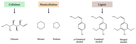 In addition to phenolic compounds, carotenoids, and many other phytoconstituents, plant-derived FLW contains carbohydrates that serve as high-potential carbon sources for microbial fermentation. While simple sugars are the most suitable substrates, they are not abundantly present in plant-derived FLW. On the other hand, polysaccharides such as cellulose, hemicellulose, and lignin are found in adequate concentrations and can be converted into their monomeric fermentable units. In lignocellulosic biomass, cellulose typically represents the most considerable fraction (30–50%), followed by hemicellulose (20–35%) and lignin (15–30%) [14]. However, cellulose is embedded in and linked to hemicellulose and lignin (Figure 2), creating a significant challenge for enzymes to convert it directly into monosaccharides. The recalcitrance of the cell wall, mainly due to the presence of lignin and lignin–carbohydrate complexes, is, therefore, a significant barrier to efficient cellulose conversion [15].