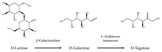 Upcycling of D-lactose from dairy waste into D-tagatose through a multi-enzyme cascade. The enzyme β-galactosidase converts D-lactose into D-galactose, and L-arabinose isomerase catalyzes the isomerization of D-galactose into D-tagatose.