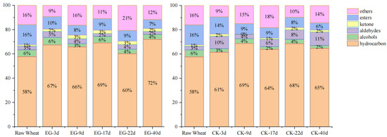 Histogram of volatile percentage stacking at each stage for experimental and control groups. CK-3d, 9d, 17d, 22d, and 40d refer to wheat samples stored naturally for 3, 9, 17, 22, and 40 days, while EG-3d, 9d, 17d, 22d, and 40d refer to wheat samples after 3, 9, 17, 22, and 40 days of infestation by rice weevil.