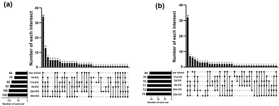 Upset plots of volatiles at each stage. (a) experimental group: EG-3d, 9d, 17d, 22d, and 40d refer to wheat samples after 3, 9, 17, 22, and 40 days of infestation by rice weevil; (b) control group: CK-3d, 9d, 17d, 22d, and 40d refer to wheat samples stored naturally for 3, 9, 17, 22, and 40 days. “The number of each set” denotes the total number of volatile species detected for each sample. “The number of each intersect” on the y-axis represents the number of shared volatiles detected by multiple databases; a point on the horizontal axis represents the number of unique volatiles detected by the database; multiple point lines on the horizontal axis represent the number of shared volatiles identified by multiple databases along the line.