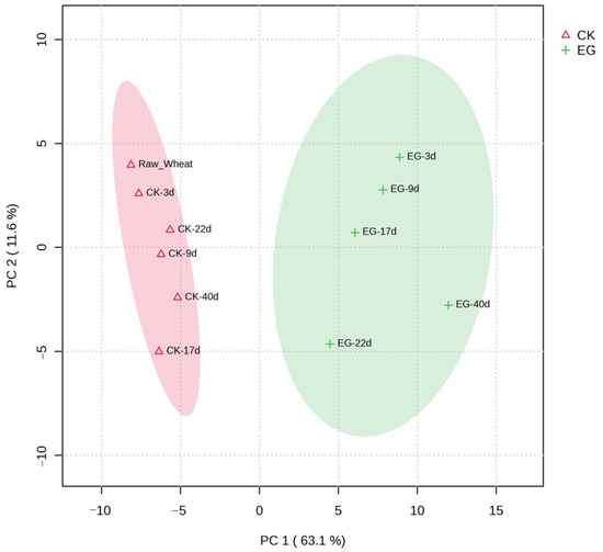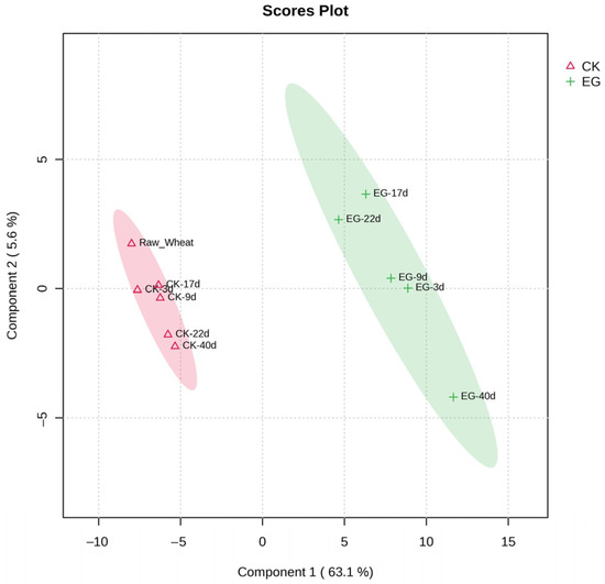 Scores of volatiles at each stage of volatile analysis between wheat and rice weevil infested wheat. CK: control group, CK-3d, 9d, 17d, 22d, and 40d refer to wheat samples stored naturally for 3, 9, 17, 22, and 40 days; EG: experimental group, EG-3d, 9d, 17d, 22d, and 40d denote wheat samples after 3, 9, 17, 22, and 40 days of infestation by rice weevil.