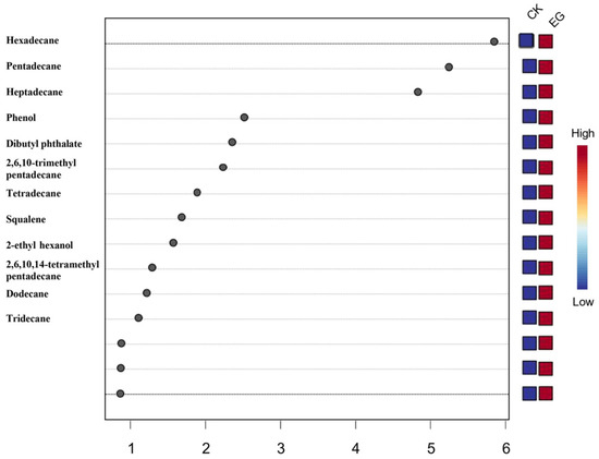 A total of 12 substances with variable importance projection (VIP) values over 1 (recommended threshold) in the PLS-DA model data were identified (Figure 5): hexadecane (p = 4.18 × 10−6), pentadecane (p = 8.24 × 10−6), heptadecane (p = 2.66 × 10−5), phenol (p = 1.45 × 10−4), dibutyl phthalate (p = 0.0513), 2, 6, 10-trimethylpentadecane (p = 2.01 × 10−6), tetradecane (p = 0.0897), squalene (p = 0.0409), 2-ethylhexanol (p = 7.72 × 10−6), 2, 6, 10, 14-tetramethylpentadecane (p = 0.0965), dodecane (p = 0.0467), and tridecane (p = 0.24) (the P-value is the parameter used to determine the results of the hypothesis test, p > 0.05 indicates no significant difference). Phenol, dibutyl phthalate, and 2-ethylhexanol levels depended on the storage environment or experimental conditions. The differences in dibutyl phthalate, tetradecane, 2, 6, 10, 14-tetramethylpentadecane, and tridecane were not obvious before and after infestation with the rice weevil (p > 0.05), while the other six substances (dodecane, pentadecane, hexadecane, heptadecane, 2, 6, 10-trimethylpentadecane, and squalene) could be used as characteristic volatiles of rice weevil-infested wheat. The relative levels of pentadecane and hexadecane changed most significantly at the earliest stage of wheat infestation, increasing from 2% to 11% during the first three days of infestation. Their contents can be employed as a criterion for determining whether or not wheat is infested by rice weevil at the earliest stage.