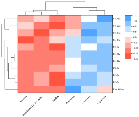 Hierarchical cluster analysis heat map of volatiles characterizing rice weevil-infested wheat. The horizontal axis denotes the volatile, and the vertical axis is the name of the sample. Colors indicate high or low expression: red (negative) indicates low expression and blue (positive) indicates high expression. The clustering trees on the top and left depict the clustering of volatiles and samples.
