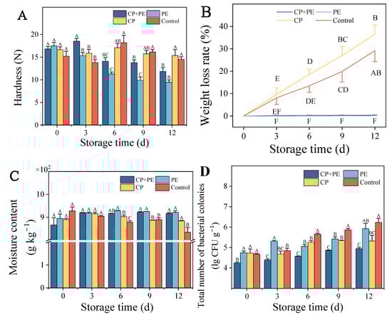 3.2.1. Hardness, Weight Loss Rate, Moisture Content, and Total Number of Bacterial Colonies