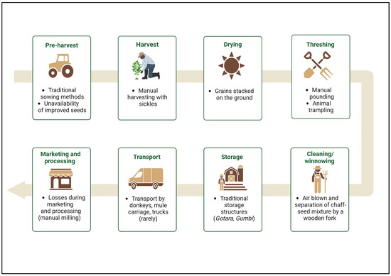 Harvested grains are stored in “Gotera” or “Gota” and “Gumbi”, sometimes referred to as “Togogo”. When stored in “Gotera” within a typical storage environment, teff is suitable for long-term storage for up to 5 years. Research performed by [87] highlighted that “Gumbi/Togogo” is made of specifically developed mud that is joined together with teff straw, while “Gotera” is constructed of bamboo with the interior section lacquered with cattle dung. These facilities have the benefit of being both locally produced and less expensive; however, they are vulnerable to damage from rats, floods, moisture, and fire. Then, teff is transported from the agricultural field to the storage area or the conventional warehouses by animals, usually donkeys. The authors of [87] reported that mule carriages and trucks are also sometimes used. Poor road conditions and a traditional means of transport are also identified as causes of grain losses. Such findings highlight the need for improved agricultural technologies and proper storage facilities to reduce human labour, avoid grain losses, and increase teff productivity.
