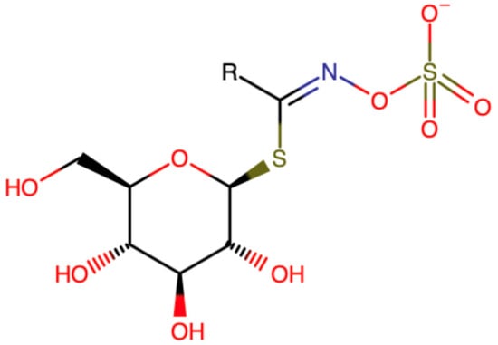 Glucosinolates (GSLs) are sulfur-containing secondary metabolites found mainly in plants of the Brassicaceae family [19]. They are the major group of phytochemicals found in cabbage [20]. Their chemical structure consists of a β-D-glucopyranose unit and an O-sulfated anomeric (Z)-thiohydroximate function, linked to an aglycone with a variable side chain (R) (Figure 2) [21]. Based on the structure of their side chain and the type of precursor amino acid, GSLs are classified into aliphatic, indonyl, and aromatic GSLs [22]. When plant tissue containing glucosinolates is damaged, the endogenous enzymes β-thioglucosidases, also known as myrosinases, are released from cell vacuoles leading to the hydrolysis of these compounds [23]. The hydrolysis products of glucosinolates include isothiocyanates (ITCs), epithionitriles (EPTs), and nitriles, based on factors like pH, availability of ferrous ions, the compound’s side chain, and substrate type [24]. ITCs, the main products of GSL hydrolysis, are mostly responsible for the health-promoting properties of cabbage, such as reduced risk of cancer and cardiovascular disease [25].