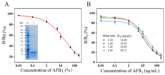 The half maximal inhibitory concentration (IC50) and limit of detection (IC10, LOD) were defined as the target concentrations that produce 50% and 10% inhibition of the signal (B/B0), respectively. Biotin binding to streptavidin with high specificity and good stability is a hotspot in the field of bioassays and can play the role of signal amplification. Among them, the preparation of biotinylated antibodies is a very important part. In general, multiple biotin can be bound to a single antibody, each of which can be coupled to SA-HRP, thereby increasing the signal intensity. In this study, biotinylated nanoantibodies were prepared by chemical modification using four different biotin molar ratios for labeling Nb-G8, which allowed the streptavidin to be coupled to the biotin without affecting the specific recognition of AFB1-BSA by the nanoantibodies. The biotinylated nanobodies were prepared with the molar ratios of nanobodies to biotin of 1:10, 1:20, 1:30, and 1:40, and BA-ELISA was constructed to evaluate the effect of biotinylation, with IC50 as the evaluation standard. The results are shown in Figure 2B; the highest sensitivity was observed when the molar ratio was 1:20 and the IC50 was 10.42 ng/mL, but the IC50 value increased gradually with the increase in the molar ratio, which might be an excess of biotin that occupied the binding site with the antigen. Compared with the conventional Nb-ELISA, biotinylated Nb-G8 had good binding activity and sensitivity to AFB1, and under the same experimental conditions, the biotin–streptavidin-based BA-ELISA had higher sensitivity than the Nb-ELISA.