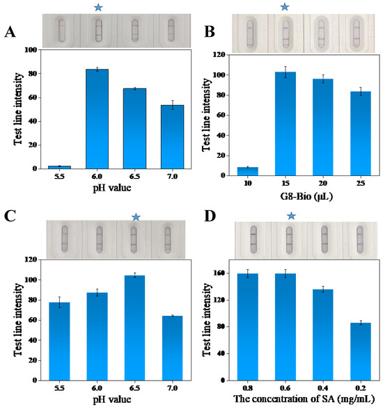 Signaling probe pH optimization (A) and G8-Bio amount optimization (B); expanded probe pH optimization (C) and SA concentration optimization (D). (The star marking is the optimal condition).