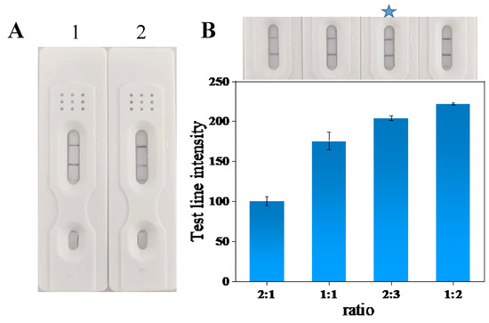 The amount of AuNFs@SA used as a signal amplification probe is one of the main reasons affecting the signal amplification effect and the sensitivity of the test strip. As shown in Figure 5B, from left to right, the ratios of AuNFs@anti-G8-Bio to AuNFs@SA probes were 2:1, 1:1, 2:3, 1:2, and the spraying amount of AuNFs@anti-G8-Bio was 7 μL/cm, and the color intensity of the T-line was gradually enhanced with the increase in the spraying amount of the AuNFs@SA probe, and then the T-line color intensity tended to be stable at 2:3. Therefore, the optimal ratio of probe AuNFs@anti-G8-Bio to AuNFs@SA is 2:3, with the AuNFs@SA probe sprayed at 11 μL/cm and the AuNFs@SA probe sprayed at 10% more to ensure good signal amplification.
